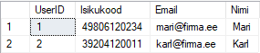 (2, '38804120111', 'Karl', 'karl@firma.ee');