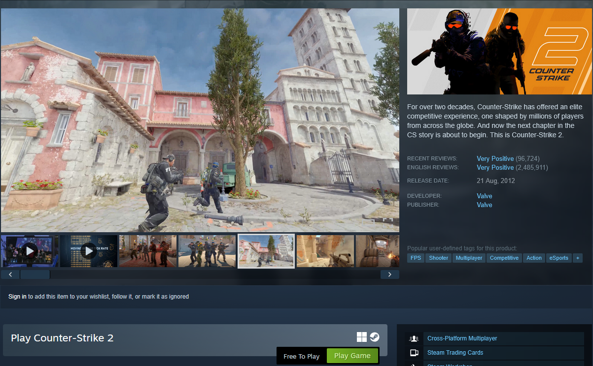 Open the Game PageIt contains discription, pictures and other useful information, that you might find useful.You need to click "Play Game" green button, afterwards you will get Counter-Strike 2 in your library.
